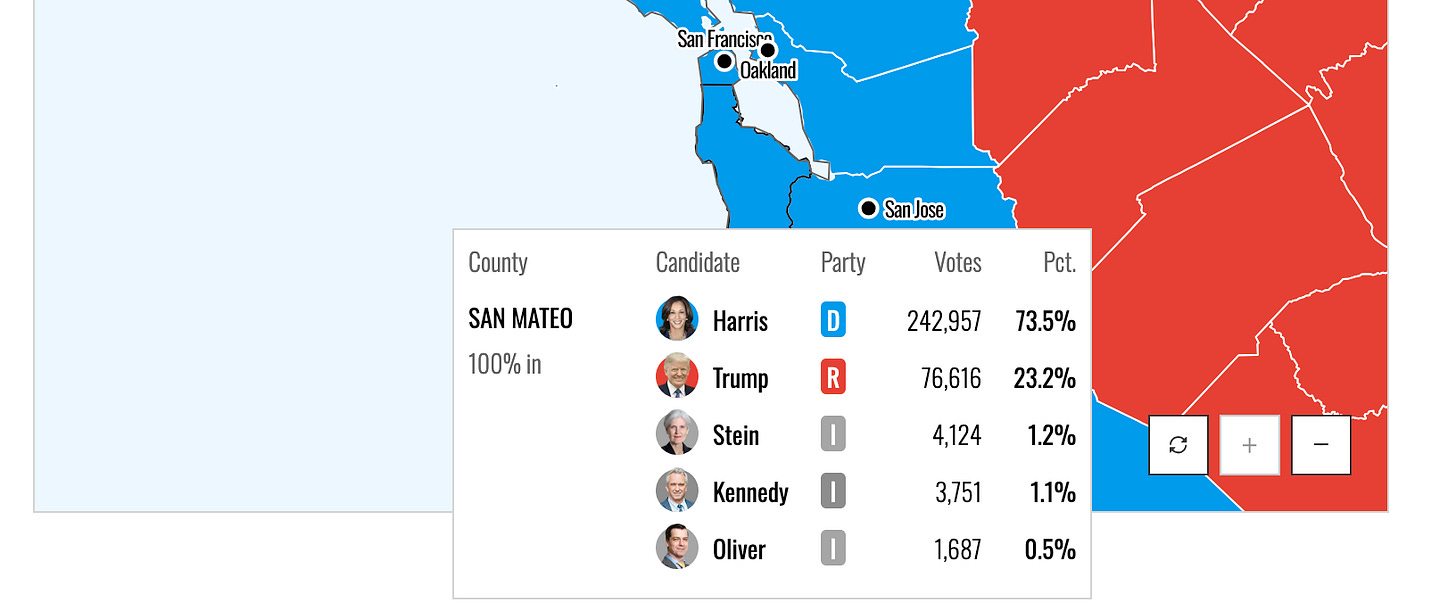 One thing you don’t hear about so much: Kamala Harris won Silicon Valley counties by 40%-53%, some of the most extreme margins in the USA. But the most visible people in the tech industry (only some of which is in Silicon Valley) are the CEOs and venture capitalists who tweet and go on podcasts. Yes, many rallied to Trump in 2024.