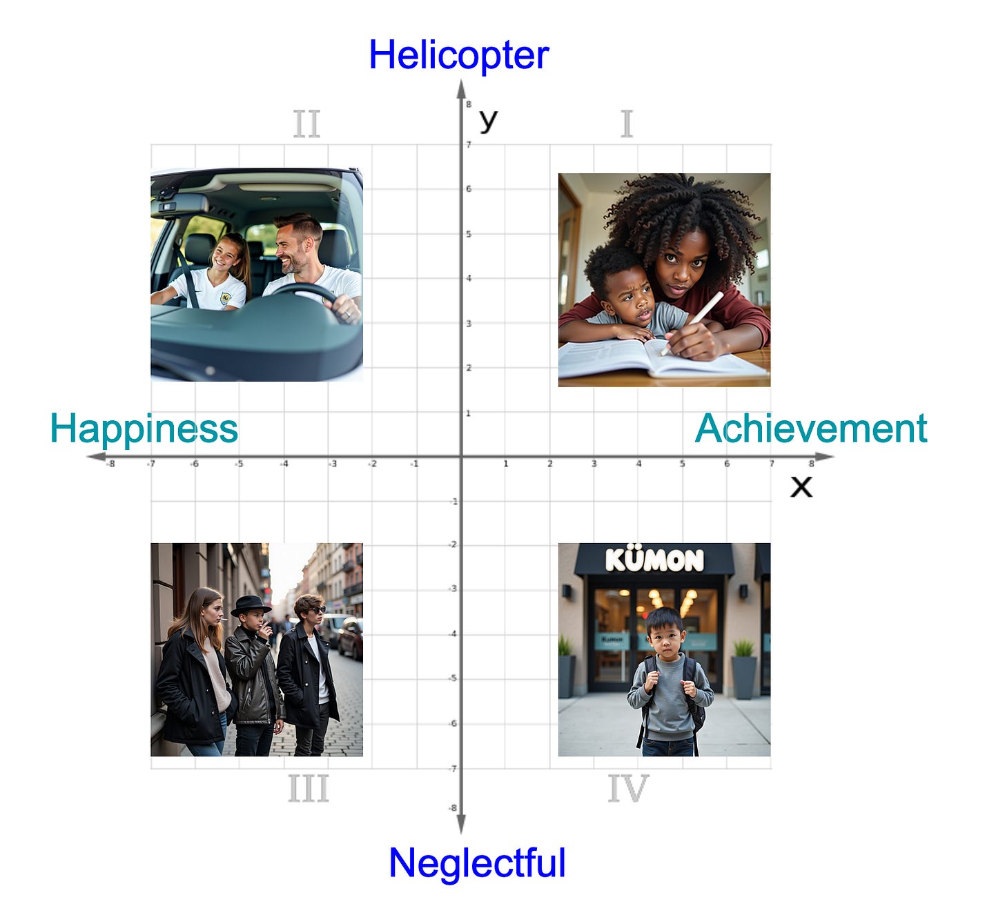 I think most people view “emotionally balanced and happy” and “successful” as two ends of a spectrum. But parenting isn’t really a one-dimensional line. There’s a second dimension, which is “how much control and supervision am I trying to exercise?” Here, I mapped it into a 2x2. We’re all management consultants here, right?